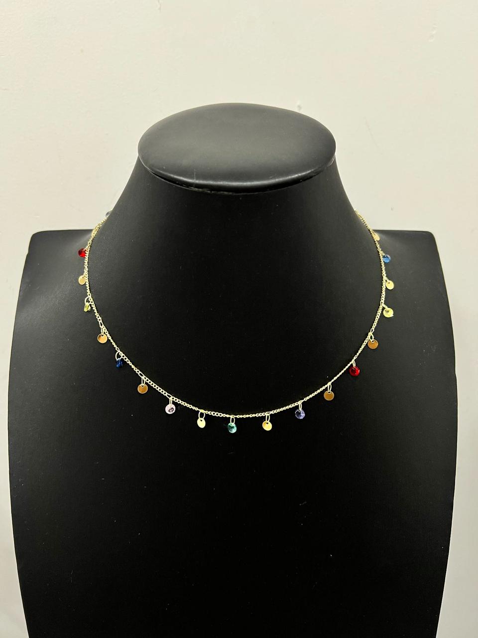 Delicado, moderno e superversátil, este colar dourado é adornado com pequenas medalhinhas lisas e cristais coloridos que criam um visual leve, divertido e cheio de charme. Ideal para compor produções descontraídas ou para adicionar um toque de cor a looks neutros.